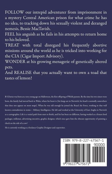 FOLLOW our intrepid adventurer from imprisonment in a mystery Central American prison for what crime he has no idea, to tracking down his sexually violent and deranged nemesis, Bessie MacTavish. FEEL his anguish as he fails in his attempts to return home to his beloved. TREAT with total disregard his frequently abortive missions around the world as he is tricked into working for the CIA (Cigar Import Advisory). WONDER at his growing menagerie of genetically altered pets. And REALISE that you actually want to own a toad that tastes of lemon!