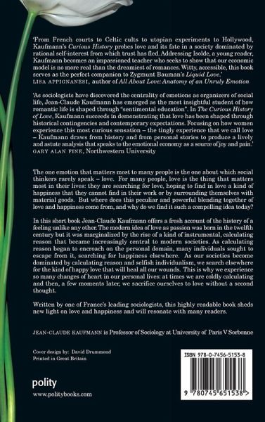 In this short book Jean-Claude Kaufmann offers a fresh account of the history of a feeling unlike any other. The modern idea of love as passion was born in the 12th century but it was marginalized by the rise of a kind of instrumental, calculating reason that became increasingly central to modern societies. As calculating reason began to encroach on the personal domain, many individuals sought to escape from it, searching for happiness elsewhere. As our societies become dominated by calculating reason and selfish individualism, we search elsewhere for the kind of happy love that will heal all our wounds. This is why we experience so many changes of heart in our personal lives: at times we are coldly calculating and then, a few moments later, we sacrifice ourselves to love without a second thought.