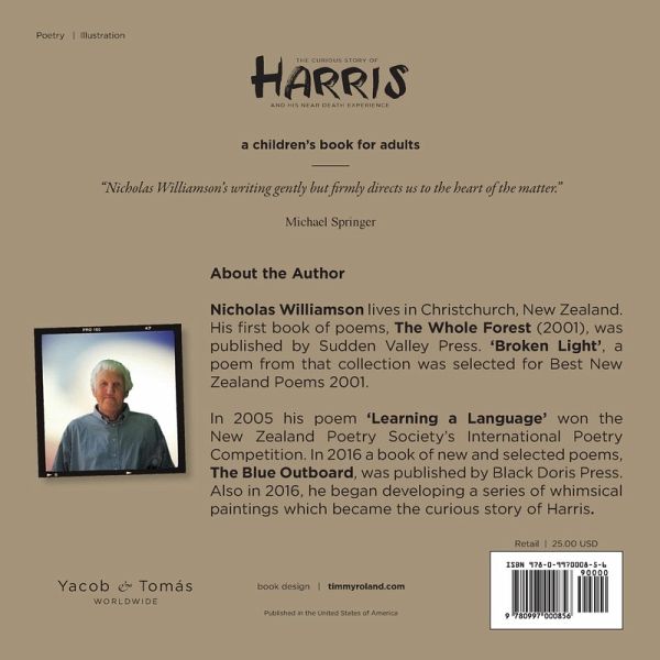 The Curious Story of Harris and His Near Death Experience . . . a children's book for adults . . . poetry and illustrations by Nicholas Williamson. So who is Harris? "Nicholas Williamson’s writing gently but firmly directs us to the heart of the matter." - Michael Springer