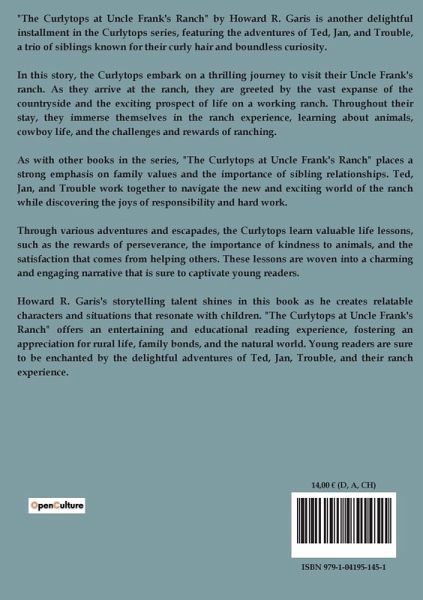 "The Curlytops at Uncle Frank's Ranch" by Howard R. Garis is another delightful installment in the Curlytops series, featuring the adventures of Ted, Jan, and Trouble, a trio of siblings known for their curly hair and boundless curiosity. In this story, the Curlytops embark on a thrilling journey to visit their Uncle Frank's ranch. As they arrive at the ranch, they are greeted by the vast expanse of the countryside and the exciting prospect of life on a working ranch. Throughout their stay, they immerse themselves in the ranch experience, learning about animals, cowboy life, and the challenges and rewards of ranching. As with other books in the series, "The Curlytops at Uncle Frank's Ranch" places a strong emphasis on family values and the importance of sibling relationships. Ted, Jan, and Trouble work together to navigate the new and exciting world of the ranch while discovering the joys of responsibility and hard work. Through various adventures and escapades, the Curlytops learn valuable life lessons, such as the rewards of perseverance, the importance of kindness to animals, and the satisfaction that comes from helping others. These lessons are woven into a charming and engaging narrative that is sure to captivate young readers. Howard R. Garis's storytelling talent shines in this book as he creates relatable characters and situations that resonate with children. "The Curlytops at Uncle Frank's Ranch" offers an entertaining and educational reading experience, fostering an appreciation for rural life, family bonds, and the natural world. Young readers are sure to be enchanted by the delightful adventures of Ted, Jan, Trouble, and their ranch experience.