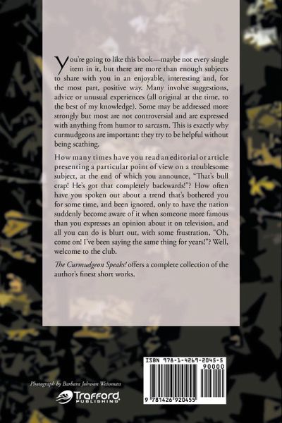You're going to like this book-maybe not every single item in it, but there are more than enough subjects to share with you in an enjoyable, interesting and, for the most part, positive way. Many involve suggestions, advice or unusual experiences (all original at the time, to the best of my knowledge). Some may be addressed more strongly but most are not controversial and are expressed with anything from humor to sarcasm. This is exactly why curmudgeons are important: they try to be helpful without being scathing. How many times have you read an editorial or article presenting a particular point of view on a troublesome subject, at the end of which you announce, "That's bull crap! He's got that completely backwards!"? How often have you spoken out about a trend that's bothered you for some time, and been ignored, only to have the nation suddenly become aware of it when someone more famous than you expresses an opinion about it on television, and all you can do is blurt out, with some frustration, "Oh, come on! I've been saying the same thing for years!"? Well, welcome to the club. The Curmudgeon Speaks offers a complete collection of the author's finest short works.