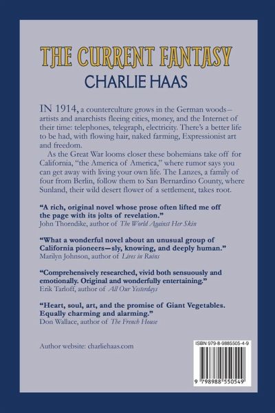 In 1914, a counterculture grows in the German woods -- artists and anarchists fleeing cities, money, and the Internet of their time: telephones, telegraph, electricity. There's a better life to be had, with flowing hair, naked farming, Expressionist art and freedom. As the Great War looms closer these bohemians take off for California, "the America of America," where rumor says you can get away with living your own life. The Lanzes, a family of four from Berlin, follow them to San Bernardino County, where Sunland, their wild desert flower of a settlement, takes root. "I was immediately drawn in. What a wonderful novel about an unusual group of California pioneers -- sly, knowing, and deeply human." Marilyn Johnson, author of The Dead Beat, This Book Is Overdue, and Lives in Ruins "The Current Fantasy is a rich, original novel whose prose often lifted me off the page with its jolts of revelation." John Thorndike, author of The World Against Her Skin "The Current Fantasy explodes on the retina like a tintype brought to life... It has heart, soul, art, and the promise of Giant Vegetables, equally charming and alarming as it tells what is perhaps the last great untold chapter of the California Story." Don Wallace, author of The French House and One Great Game, editor of The Hawaii Review of Books