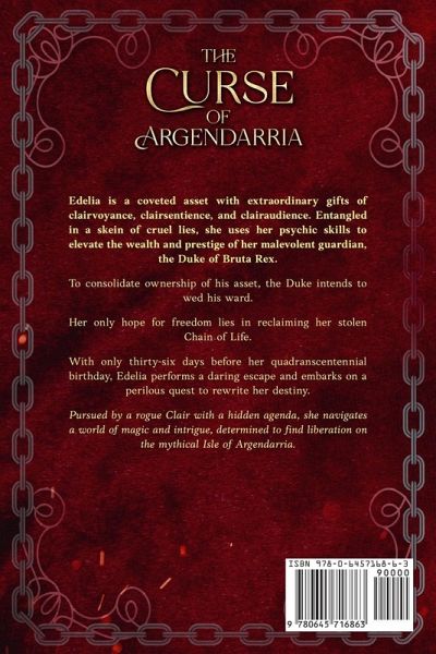 Gilded cages are still prisons. The Curse of Argendarria is a noblebright fantasy quest, featuring strong female characters who must recover an enchanted stolen artefact. Edelia is a coveted asset with extraordinary gifts of clairvoyance, clairsentience, and clairaudience. Entangled in a complex skein of cruel lies, she is forced to use her psychic skills to elevate the wealth and prestige of her malevolent guardian, the Duke of Bruta Rex. To consolidate ownership of his asset, the Duke intends to wed his ward. Her only hope for freedom lies in reclaiming her stolen Chain of Life. With only thirty-six days before her quadranscentennial birthday, Edelia performs a daring escape and embarks on a perilous quest to rewrite her destiny. She teams up with another young woman, a solitary loner who values her privacy and independence. Together, they traverse wetlands, haunted forests, icy deserts, and explore an abandoned underground city. Pursued by the Duke's malicious son, and a rogue Clair with her own nefarious agenda, they navigate a world of magic and intrigue, determined to find liberation on the mythical Isle of Argendarria. If such a place truly exists.