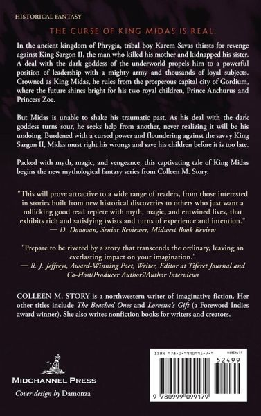 The curse of King Midas is real. In the ancient kingdom of Phrygia, tribal boy Karem Savas thirsts for revenge against King Sargon II, the man who killed his mother and kidnapped his sister. A deal with the dark goddess of the underworld propels him to a powerful position of leadership with a mighty army and thousands of loyal subjects. Crowned as King Midas, he rules from the prosperous capital city of Gordium, where the future shines bright for his two royal children, Prince Anchurus and Princess Zoe. But Midas is unable to shake his traumatic past. As his deal with the dark goddess turns sour, he seeks help from another, never realizing it will be his undoing. Burdened with a cursed power and floundering against the savvy King Sargon II, Midas must right his wrongs and save his children before it is too late. Packed with myth, magic, and vengeance, this captivating tale of King Midas begins the new mythological fantasy series from Colleen M. Story.