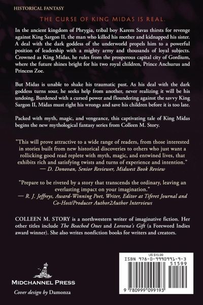 The curse of King Midas is real. In the ancient kingdom of Phrygia, tribal boy Karem Savas thirsts for revenge against King Sargon II, the man who killed his mother and kidnapped his sister. A deal with the dark goddess of the underworld propels him to a powerful position of leadership with a mighty army and thousands of loyal subjects. Crowned as King Midas, he rules from the prosperous capital city of Gordium, where the future shines bright for his two royal children, Prince Anchurus and Princess Zoe. But Midas is unable to shake his traumatic past. As his deal with the dark goddess turns sour, he seeks help from another, never realizing it will be his undoing. Burdened with a cursed power and floundering against the savvy King Sargon II, Midas must right his wrongs and save his children before it is too late. Packed with myth, magic, and vengeance, this captivating tale of King Midas begins the new mythological fantasy series from Colleen M. Story.
