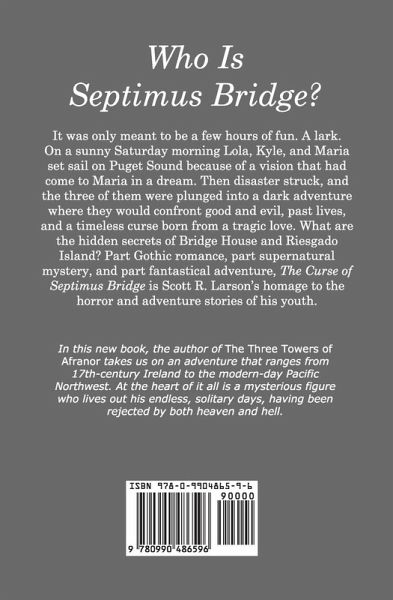 It was only meant to be a few hours of fun. A lark. On a sunny Saturday morning Lola, Kyle and Maria set sail on Puget Sound to look for a vision that had come to Maria in a dream. Then disaster struck, and the three of them were plunged into a dark adventure in which they would confront good and evil, past lives, and a timeless curse born from a tragic love. What are the hidden secrets of Bridge House and Riesgado Island? Part Gothic romance, part supernatural mystery and part fantastical adventure, The Curse of Septimus Bridge is Scott R. Larson's homage to the horror and adventure stories of his youth, notably the 1960s television series Dark Shadows. In this new book, the author of The Three Towers of Afranor takes us on an adventure that ranges from 17th-century Ireland to the Pacific Northwest of today. At the heart of it all is the mysterious figure who lives out his endless, solitary days, having been rejected by both heaven and hell.