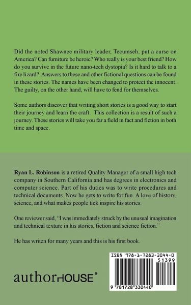 Did the noted Shawnee military leader, Tecumseh, put a curse on America? Can furniture be heroic? Who really is your best friend? How do you survive in the future nano-tech dystopia? Is it hard to talk to a fire lizard? Answers to these and other fictional questions can be found in these stories. The names have been changed to protect the innocent. The guilty, on the other hand, will have to fend for themselves. Some authors discover that writing short stories is a good way to start their journey and learn the craft. This collection is a result of such a journey. These stories will take you far a field in fact and fiction in both time and space.