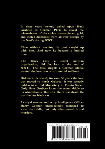 In sixty years no-one called upon Hans Grubber ex German POW to reveal the whereabouts of the stolen masterpieces, gold, and looted diamonds from all over Europe by the Nazi's during WW11. Then without warning his past caught up with him. And now he became a hunted man. The Black Cats, a secret German organisation, hid the loot at the end of WW11. The Blue knights a German Mafia, wanted the loot now worth untold millions. Hidden in Scotland, for over 50 years the loot was moved to north Majorca. It was secretly hidden in an old Monastery in Puerto Soller. Only Hans Grubber knew the secret riddle to its whereabouts. But now Han's was dead. He was the last black cat. Ex royal marine and army intelligence Officer Harry Cooper, unexpectedly managed to solve the riddle, but only after several brutal murders.