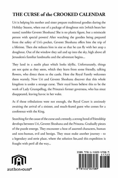 THE CURSE of the CROOKED CALENDAR Uri is helping his mother and sister prepare traditional goodies during the Holiday Season, when out of a package of doughnut mix [which bears her name] tumbles Geveret Shoshana! She is no plastic figure, but a miniscule person with special powers! After watching the goodies being prepared from the safety of Uri's pocket, Geveret Shoshana offers him the trip of a lifetime. Then she reduces him in size so that he can fly with her atop a doughnut. Out of the window they sail and up into the sky, high above all Jerusalem's familiar landmarks and the adventure begins... They land in a sunlit place which looks idyllic. Unfortunately, things are not quite as they seem, which they learn from some friendly, talking flowers, who direct them to the castle. Here the Royal Family welcomes them warmly. Now Uri and Geveret Shoshana discover that this whole kingdom is under a strange curse. Their royal hosts believe this to be the work of Lady Grumpelhag, the Princess's former governess, who has since disappeared, leaving havoc in her wake. As if those tribulations were not enough, the Royal Court is anxiously awaiting the arrival of a sinister, and much-feared guest who comes for a conference with the King. Searching for the cause of the curse and a remedy, a strong bond of friendship develops between Uri, Geveret Shoshana and the Princess. Gradually pieces of the puzzle emerge. They encounter a host of assorted characters, human and non-human, evil and benign. They must make another journey - to a legendary and eerie place, where the solution lies,and this expedition is fraught with peril all the way...