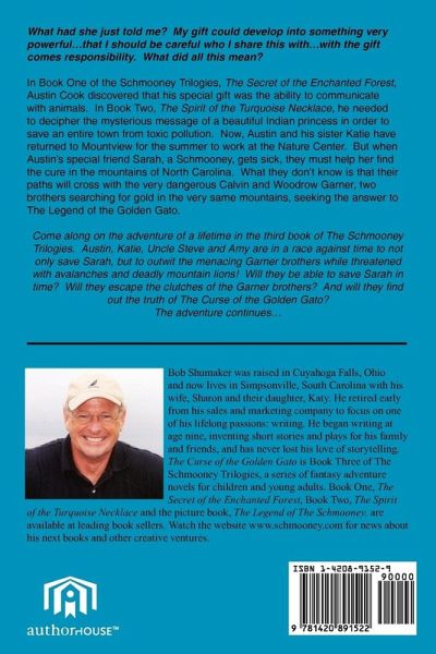 What had she just told me? My gift could develop into something very powerful.that I should be careful who I share this with.with the gift comes responsibility. What did all this mean? In Book One of the Schmooney Trilogies, The Secret of the Enchanted Forest, Austin Cook discovered that his special gift was the ability to communicate with animals. In Book Two, The Spirit of the Turquoise Necklace, he needed to decipher the mysterious message of a beautiful Indian princess in order to save an entire town from toxic pollution. Now, Austin and his sister Katie have returned to Mountview for the summer to work at the Nature Center. But when Austin's special friend Sarah, a Schmooney, gets sick, they must help her find the cure in the mountains of North Carolina. What they don't know is that their paths will cross with the very dangerous Calvin and Woodrow Garner, two brothers searching for gold in the very same mountains, seeking the answer to The Legend of the Golden Gato. Come along on the adventure of a lifetime in the third book of The Schmooney Trilogies. Austin, Katie, Uncle Steve and Amy are in a race against time to not only save Sarah, but to outwit the menacing Garner brothers while threatened with avalanches and deadly mountain lions! Will they be able to save Sarah in time? Will they escape the clutches of the Garner brothers? And will they find out the truth of The Curse of the Golden Gato? The adventure continues.