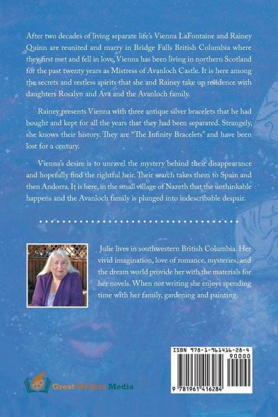 After two decades of living separate life's Vienna LaFontaine and Rainey Quinn are reunited and marry in Bridge Falls British Columbia where they first met and fell in love. Vienna has been living in northern Scotland for the past twenty years as Mistress of Avanloch Castle. It is here among the secrets and restless spirits that she and Rainey take up residence with daughters Rosalyn and Ava and the Avanloch family. Rainey presents Vienna with three antique silver bracelets that he had bought and kept for all the years that they had been separated. Strangely, she knows their history. they are "The Infinity Bracelets" and have been lost for a century. Vienna's desire is to unravel the mystery behind their disappearance and hopefully find the rightful heir. Their search takes them to Spain and then Andorra. It is here, in the small village of Nazeth that the unthinkable happens and the Avanloch family is plunged into indescribable despair.