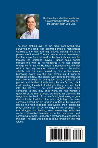 The man ambled over to the great cottonwood tree, surveying the land. The squirrel barked a high-pitched warning to the man from high above, alerting him to the presence of the wolf. The man was now less than twenty-five feet away from the wolf as his black shoes trampled through the crackling leaves. He knew he needed to cut the man off from his only escape route-the boat, so he waited silently until the man passed by him in the leaves. The patient wolf decided the time was right. He uncoiled in one quick flash, sprung off the ground and landed directly onto the man's long black coat, sending them both tumbling to the ground and back into the leaves. The man's screams pierced the air, and he grabbed at his wounded leg as the wolf retreated backwards. The man dragged his bleeding, now useless leg behind him as he crab-walked backwards on his hands and feet, screaming for help. Suddenly a terrifying thought came to the man --no help was going to come for him on this Wolf Island.