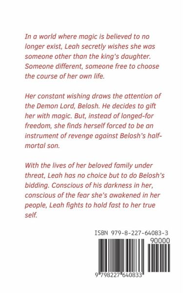 In a world where magic is believed to no longer exist, Leah secretly wishes she was free to choose the course of her own life and not tied to royal duties. Her constant wishing draws the attention of the Demon Lord, Belosh; he gifts her with magic. But, instead of longed-for freedom, she finds she is now an instrument of revenge against Belosh's half-mortal son. With the lives of her beloved family under threat, Leah has no choice but to do Belosh's bidding. Conscious of his darkness in her, conscious of the fear she's awakened in her people, Leah fights to hold fast to her true self. Second edition