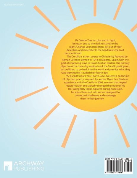 De Colores! See in color and in light; bring an end to the darkness and to the night. Change your perception, get out of your detention, and remember to the Good News the Lord has mentioned. The Cursillo is a short course in Christianity founded by Roman Catholic laymen in 1944 in Majorca, Spain, with the goal of improving ways to train Christian leaders. The primary objective of the three-day session to ask the Cursillo participants, or cursillistas, to go back into the world and practice what they have learned; this is called their fourth day. The Cursillo: How's Your Fourth Day? presents a collection of hip-hop poetry inspired by author Ryan Lee Nevins's experience with the Cursillo in 2006, an event that helped restore his faith and radically changed the course of his life. Taking forty topics explored during his session, he spins them out into verses designed to connect with believers and encourage them in their journey.