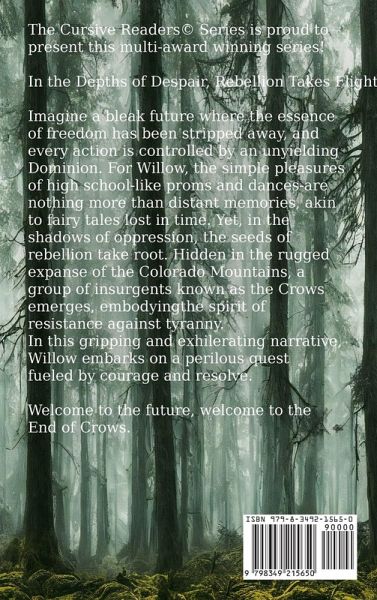 In The Depths of Despair, Rebellion Takes Flight Imagine a bleak future where the essence of freedom has been stripped away, and every action is controlled by an unyielding Dominion. For Willow, the simple pleasures of high school-like proms, dances and boyfriends- are nothing more than distant memories, akin to fairy tales lost in time. Yet, in the shadows of oppression, the seeds of rebellion take root. Hidden in the rugged expanse of the Colorado Mountains, a group of insurgents known as the Crows emerges, embodying the spirit of resistance against tyranny. In this gripping and exhilarating narrative, Willow embarks on a perilous quest fueled by courage and resolve. She becomes entwined with the Crows, the last flicker of hope in a world dominated by the Dominion's ruthless grip, as they fight to preserve the remnants of human dignity. 'End of Crows' delves into the unyielding human spirit that refuses to submit, even in the darkest of circumstances, portraying the fierce struggle between liberty and subjugation, optimism and despair, survival and capitulation. I invite you to accompany Willow on her quest for freedom, to embrace life and love amidst chaos. 'End of Crows' promises to be a captivating and inspiring journey that will leave you questioning the true nature of power-whether it lies with the oppressor or the oppressed. Welcome to the Future. Welcome to the End of Crows.