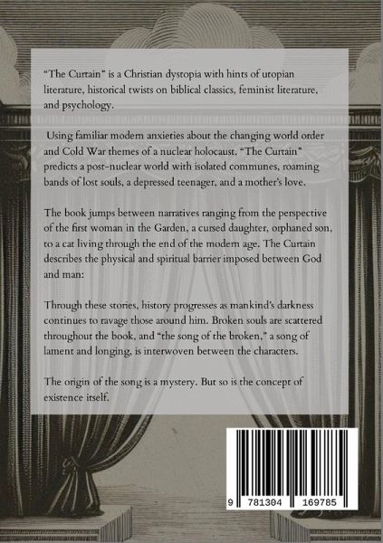 "The Curtain" is a Christian dystopia with hints of utopian literature, historical twists on biblical classics, feminist literature, and psychology. Using familiar modern anxieties about the changing world order and Cold War themes of a nuclear holocaust, "The Curtain" predicts a post-nuclear world with isolated communes, roaming bands of lost souls, a depressed teenager, and a mother's love. The book jumps between narratives ranging from the perspective of the first woman in the Garden, a cursed daughter, orphaned son, to a cat living through the end of the modern age. The Curtain describes the physical and spiritual barrier imposed between God and man: Through these stories, history progresses as mankind's darkness continues to ravage those around him. Broken souls are scattered throughout the book, and "the song of the broken," a song of lament and longing, is interwoven between the characters. The origin of the song is a mystery. But so is the concept of existence itself.