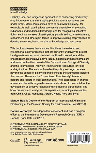 Globally, local and indigenous approaches to conserving biodiversity, crop improvement, and managing precious natural resources are under threat. Many communities have to deal with 'biopiracy,' for example. As well, existing laws are usually unsuitable for protecting indigenous and traditional knowledge and for recognizing collective rights, such as in cases of participatory plant breeding, where farmers, researchers and others join forces to improve existing crop varieties or develop new ones, based on shared knowledge and resources. This book addresses these issues. It outlines the national and international policy processes that are currently underway to protect local genetic resources and related traditional knowledge and the challenges these initiatives have faced. In particular these themes are addressed within the context of the Convention of Biological Diversity and the International Treaty on Plant Genetic Resources for Food and Agriculture. The authors broaden the policy and legal debates beyond the sphere of policy experts to include the knowledge-holders themselves. These are the 'custodians of biodiversity': farmers, herders and fishers in local communities. Their experience in sharing access and benefits to genetic resources is shown to be crucial for the development of effective national and international agreements. The book presents and analyzes this experience, including case studies from China, Cuba, Honduras, Jordan, Nepal, Peru and Syria. Copublished with the International Development Research Centre (IDRC).