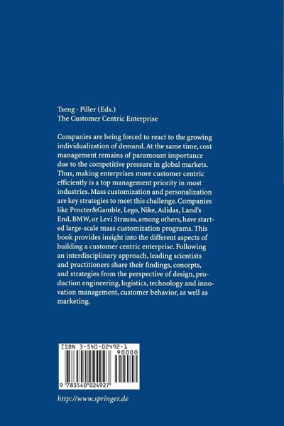 Companies are being forced to react to the growing individualization of demand. At the same time, cost management remains of paramount importance due to the competitive pressure in global markets. Thus, making enterprises more customer centric efficiently is a top management priority in most industries. Mass customization and personalization are key strategies to meet this challenge. Companies like Procter&Gamble, Lego, Nike, Adidas, Land`s End, BMW, or Levi Strauss, among others, have started large-scale mass customization programs. This book provides insight into the different aspects of building a customer centric enterprise. Following an interdisciplinary approach, leading scientists and practitioners share their findings, concepts, and strategies from the perspective of design, production engineering, logistics, technology and innovation management, customer behavior, as well as marketing.