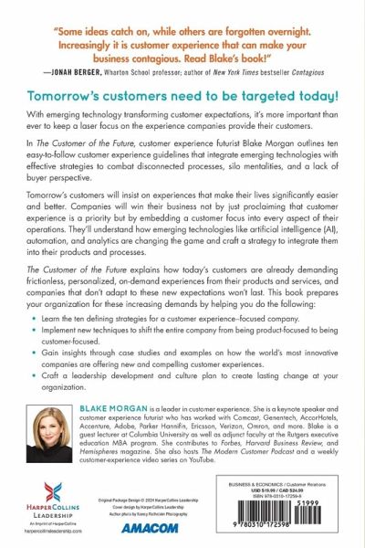 With emerging technology transforming customer expectations, it's important to keep a laser focus on the experience companies provide their customers. Tomorrow's customers need to be targeted today! Customer experience futurist Blake Morgan outlines ten easy-to-follow customer experience guidelines that integrate emerging technologies with effective strategies to combat disconnected processes, silo mentalities, and a lack of buyer perspective. The Customer of the Future explains how today's customers are already demanding frictionless, personalized, on-demand experiences from their products and services, and companies that don't adapt to these new expectations won't last. This book prepares your organization for these increas¿¿ing demands by helping you do the following: Learn the ten defining strategies for a customer experience-focused company. Implement new techniques to shift the entire company from being product-focused to being customer-focused. Gain insights through case studies and examples on how the world's most innovative companies are offering new and compelling customer experiences. Tomorrow's customers will insist on experiences that make their lives significantly easier and better. Craft a leadership development and culture plan to create lasting change at your organization!