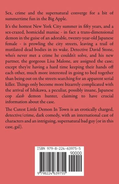 Sex, crime and the supernatural converge for a bit of summertime fun in the Big Apple. It's the hottest New York City summer in fifty years, and a sex-crazed, homicidal maniac - in fact a trans-dimensional demon in the guise of an adorable, twenty-year-old Japanese female - is prowling the city streets, leaving a trail of mutilated dead bodies in its wake. Detective David Stone, who's never met a crime he couldn't solve, and his new partner, the gorgeous Lisa Malone, are assigned the case; except they're having a hard time keeping their hands off each other, much more interested in going to bed together than being out on the streets searching for an apparent serial killer. Things only become more bizarrely complicated with the arrival of Ishikawa, a peculiar, possibly insane, Japanese cop slash demon hunter, claiming to have crucial information about the case. The Cutest Little Demon In Town is an erotically charged, detective/crime, dark comedy, with an international cast of characters and an intriguing, supernatural bad guy (or in this case, gal).
