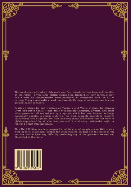 The confidence with which this work was first introduced has been well justified by the result - a very large edition having been disposed of. Very rarely, if ever, has a work so comprehensive been published in connection with the art of cutting. Though nominally a work on Juvenile Cutting, it embraces nearly every garment made by tailors. Besides systems for and treatises on Trousers and Veats, systems for Morning Coats and Dress Coats, it also deals with Military Garments, Liveries, and many other garments, all worked out by a system which has now become well-nigh universally popular, a unique feature of the work being its beautifully engraved illustrations and diagrams. We have had very many indications that the work is highly appreciated by all who have procured it, and many testimonies might be recorded if that were necessary. This Third Edition has been prepared in all its original completeness. With such a work in their possession, neither the inexperienced student nor the cutter in full practice should have any difficulty producing any of the garments treated and illustrated in this work.
