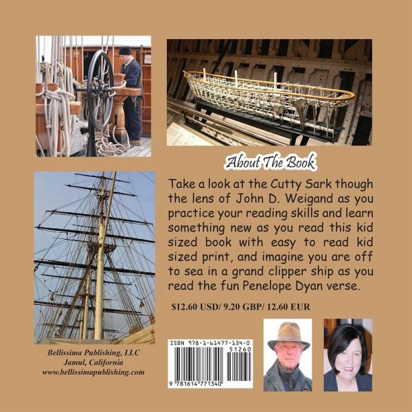 The Cutty Sark is a British clipper ship. Built on the Clyde in 1869 for the Jock Willis shipping line, one of the last tea clippers to be built and one of the fastest. This ship was built at the end of a long period of design development that was unfortunately halted as sailing ships gave way to ships driven by steam propulsion. You see this ship used the power of the wind and gathered the wind in its sails to further its journey, The Cutty Sark was very badly damaged by fire on May 21, 2007 as it was under restoration. It was re-opened to the public on April 25, 2012, much to the delight of would be seafaring kids and adults. Take a look at the Cutty Sark from below and above through the lens of John D. Weigand. Practice reading skills through word recognition, word repetition and rhyme as you learn some fun facts and then get to work on some research of your own, The point of all these books by Dyan and Weigand is to make kids not only learn, but also to learn to think as well as to imagine. Award winning author, attorney and former teacher, Penelope Dyan loves kids, loves to learn herself and loves it when kids learn. There is a free music video that goes along with this book on YouTube on the Bellissimavideo YouTube channel to further enhance the learning process. The book is dedicated to a true seafaring soul.