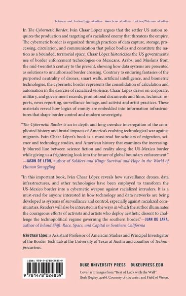 In The Cybernetic Border, Iván Chaar López argues that the settler US nation requires the production and targeting of a racialized enemy that threatens the empire. The cybernetic border is organized through practices of data capture, storage, processing, circulation, and communication that police bodies and constitute the nation as a bounded, territorial space. Chaar López historicizes the US government's use of border enforcement technologies on Mexicans, Arabs, and Muslims from the mid-twentieth century to the present, showing how data systems are presented as solutions to unauthorized border crossing. Contrary to enduring fantasies of the purported neutrality of drones, smart walls, artificial intelligence, and biometric technologies, the cybernetic border represents the consolidation of calculation and automation in the exercise of racialized violence. Chaar López draws on corporate, military, and government records, promotional documents and films, technical reports, news reporting, surveillance footage, and activist and artist practices. These materials reveal how logics of enmity are embedded into information infrastructures that shape border control and modern sovereignty.