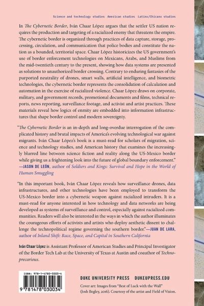In The Cybernetic Border, Iván Chaar López argues that the settler US nation requires the production and targeting of a racialized enemy that threatens the empire. The cybernetic border is organized through practices of data capture, storage, processing, circulation, and communication that police bodies and constitute the nation as a bounded, territorial space. Chaar López historicizes the US government's use of border enforcement technologies on Mexicans, Arabs, and Muslims from the mid-twentieth century to the present, showing how data systems are presented as solutions to unauthorized border crossing. Contrary to enduring fantasies of the purported neutrality of drones, smart walls, artificial intelligence, and biometric technologies, the cybernetic border represents the consolidation of calculation and automation in the exercise of racialized violence. Chaar López draws on corporate, military, and government records, promotional documents and films, technical reports, news reporting, surveillance footage, and activist and artist practices. These materials reveal how logics of enmity are embedded into information infrastructures that shape border control and modern sovereignty.