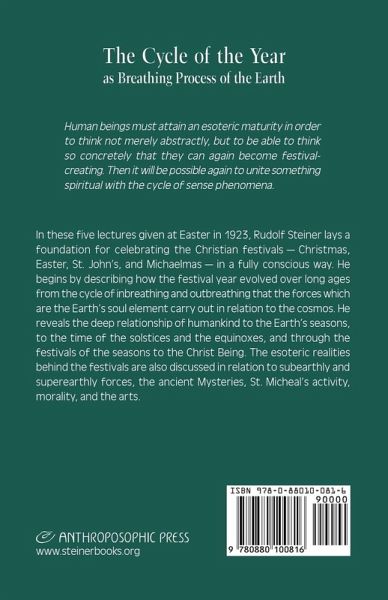 In these five lectures given at Easter in 1923, Rudolf Steiner lays a foundation for celebrating the Christian festivals -- Christmas, Easter, St. John's, and Michaelmas -- in a fully conscious way. He describes how the festival year evolved over long ages from the cycle of inbreathing and outbreathing that the forces which are the Earth's soul element carry out in relation to the cosmos, and reveals the deep relationship of humankind to the Earth's seasons, to the time of the solstices and the equinoxes, and through the festivals of the seasons to the Christ Being..