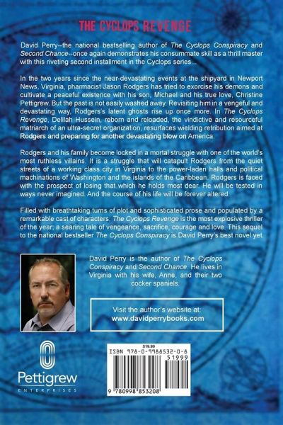 In the two years since the near-devastating events at the shipyard in Newport News, Virginia, pharmacist Rodgers has tried to exorcise his demons and cultivate a peaceful, existence with his son, Michael and his true love, Christine Pettigrew. But the past is not easily washed away. Revisiting him in a vengeful and devastating way. Rodgers latent ghosts rise up once more. In the Cyclops Revenge, Delilah Hussein, reborn and reloaded, the vindictive and resourceful matriarch of an ultra-secret organization, resurfaces wielding retribution aimed at Rodgers and preparing for another blow on America. Rodgers and his family become locked in a mortal struggle with one of the most ruthless villains. It is a struggle will catapult Rodgers from the quiet streets of Newport News, Virginia, to the power-laden halls and political machinations of Washington, and the islands of the Caribbean. Rodgers is faced with the prospect of losing that which he holds most dear. He will be tested in ways he never imagined possible. And the course of his life will be forever altered. Filled with breathtaking turns of plot and sophisticated prose, and populated by a remarkable cast of characters, The Cyclops Revenge is the most explosive thriller of the year. It is a searing tale of vengeance, courage and love created by a master wordsmith. And it is David Perry's best novel yet. David Perry is the author of The Cyclops Conspiracy and Second Chance. He lives in Virginia with his wife, Anne, and their two cocker spaniels. Visit the author's website at: www.davidperrybooks.com
