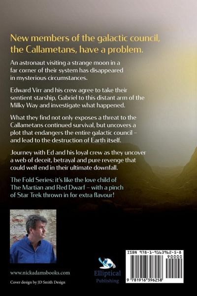 New members of the galactic council, the Callametans, have a problem. An astronaut visiting a strange moon in a far corner of their system has disappeared in mysterious circumstances. Edward Virr and his crew agree to take their sentient starship, Gabriel to this distant arm of the Milky Way and investigate what happened. What they find not only exposes a threat to the Callametans continued survival, but uncovers a plot that endangers the entire galactic council - and lead to the destruction of Earth itself. Journey with Ed and his loyal crew as they uncover a web of deceit, betrayal and pure revenge that could well end in their ultimate downfall. The Fold Series: it's like the love child of The Martian and Red Dwarf - with a pinch of Star Trek thrown in for extra flavour!