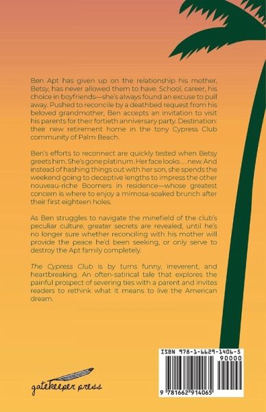 Ben Apt has given up on the relationship his mother, Betsy, has never allowed them to have. School, career, his choice in boyfriends-she's always found an excuse to pull away. Pushed to reconcile by a deathbed request from his beloved grandmother, Ben accepts an invitation to visit his parents for their fortieth anniversary party. Destination: their new retirement home in the tony Cypress Club community of Palm Beach. Ben's efforts to reconnect are quickly tested when Betsy greets him. She's gone platinum. Her face looks. . . new. And instead of hashing things out with her son, she spends the weekend going to deceptive lengths to impress the other nouveau-riche Boomers in residence-whose greatest concern is where to enjoy a mimosa-soaked brunch after their first eighteen holes. As Ben struggles to negotiate the minefield of the club's peculiar culture, greater secrets are revealed, until he's no longer sure whether reconciling with his mother will provide the peace he'd been seeking, or only serve to destroy the Apt family completely. The Cypress Club is by turns funny, irreverent, and heartbreaking. An often-satirical tale that explores the painful prospect of severing ties with a parent and invites readers to rethink what it means to live the American dream.