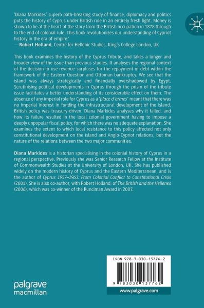This book examines the history of the Cyprus Tribute, and takes a longer and broader view of the issue than previous studies. It analyses the regional context of the decision to use revenue surpluses for the repayment of debt within the framework of the Eastern Question and Ottoman bankruptcy. We see that the island was always strategically and financially overshadowed by Egypt. Scrutinising political developments in Cyprus through the prism of the tribute issue facilitates a better understanding of its considerable effect on them. The absence of any imperial role for Cyprus as a 'place d'armes' meant that there was no imperial interest in funding the infrastructural development of the island. British policy was treasury-driven. Diana Markides analyses why it failed, and how its failure resulted in the local colonial government having to impose a deeply unpopular fiscal policy, for which there was no adequate explanation. She examines the extent to which local resistance to this policy affected not only constitutional development on the island and Anglo-Cypriot relations, but the nature of the relations between the two major communities.