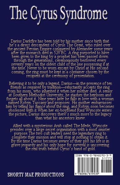 Darius Darkfire has been told by his mother since birth that he's a direct descendant of Cyrus the Great who ruled over the ancient Persian Empire conquered by Alexander some years after the monarch died in five-twenty-nine BC. A ring purported to have been given to the king by a prophet has been passed down through the generations, ceremoniously bestowed every seventy years on the oldest child of the one possessing it at the time. Never to be worn except by Christ at His Second Coming, the ring must be kept in a container chosen by the recipient at the ceremony of presentation. Believing it to be only a legend, Darius-in the presence of ten friends as required by tradition-reluctantly accepts the ring from his mom, who inherited it when her mother died. A senior at Southern Methodist University, he stashes the heirloom and forgets all about it. Nine years later he falls in love with a woman named Robyn Tuscany and proposes. His mother embarrasses him by telling his fiancé about the ring and Robyn soon becomes obsessed with it. When her ex-boyfriend Raul Wyncote enters the picture, Darius discovers there's much more to the legacy than what his ancestors knew. Allied with a mysterious Arab named Arash Arshia, called The Mede, Wyncote presides over a large secret organization with a most sinister purpose. The two cult leaders need the legendary ring to complete their mission and will stop at nothing to obtain it. By the time Darius becomes aware of their plot his life is in grave jeopardy and his only hope for survival is uncovering the real truth behind Cyrus's band of gold.