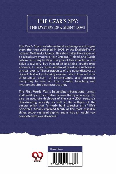 The Czar's Spy is an international espionage and intrigue story that was published in 1905 by the English/French novelist William Le Queux. This story takes the reader on a slalom journey across Italy, England, Finland, and Russia before returning to Italy. The goal of this expedition is to solve a mystery, but instead of providing sought-after answers, it simply raises additional questions and causes unclear events. The protagonist of the novel discovers a ripped photo of a stunning woman, falls in love with this unfortunate victim of circumstance, and sacrifices everything to save her. Love, murder, treachery, and mystery are all elements of the plot. The First World War's impending international unrest and hostility are foretold in the novel fairly accurately. It is also an accurate depiction of the early 20th century's deteriorating morality, as well as the collapse of the central pillar that formerly held together all of life's principles. Money replaced family as the most essential thing, power replaced dignity, and a little girl could now compete with world leaders!
