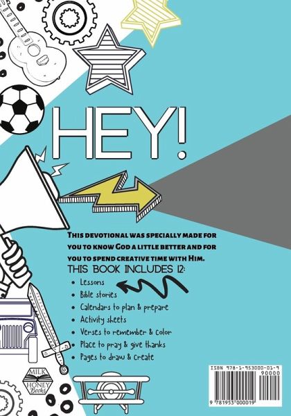 Hey! The Daddy's Boy Devotional was created just for you, by a mom and her son who is close your age! It's all about how much God loves you and how we can show others how much we love Him. We hope that you will use this book to draw & dream & write & read & color as you spend with Jesus. It is a journal, planner, activity book and devotional all in one. Adults: It is designed for boys ages 6-10 but can be used for all ages. A perfectly sized 7x10 in (178mm x 254mm) book for the special guy in your life to color, create and grow in his faith. Includes:o 12 Lessonso 12 Bible Storieso 12 Weekly Undated Calendars to Plan & Createo 12 Activity Sheetso 12 Verses to Coloro 12 Places to Pray & Give Thankso 24 Pages to Draw & Color