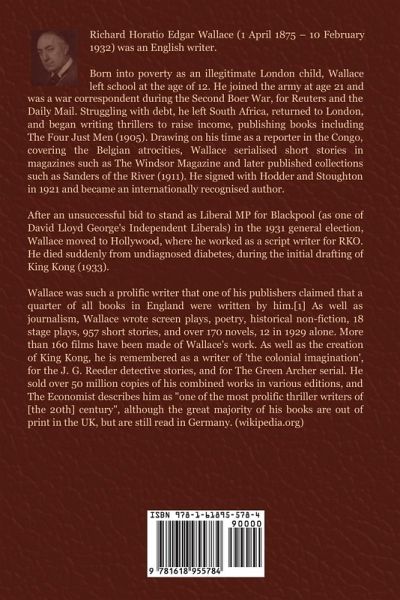 Richard Horatio Edgar Wallace (1 April 1875 – 10 February 1932) was an English writer. Born into poverty as an illegitimate London child, Wallace left school at the age of 12. He joined the army at age 21 and was a war correspondent during the Second Boer War, for Reuters and the Daily Mail. Struggling with debt, he left South Africa, returned to London, and began writing thrillers to raise income, publishing books including The Four Just Men (1905). Drawing on his time as a reporter in the Congo, covering the Belgian atrocities, Wallace serialised short stories in magazines such as The Windsor Magazine and later published collections such as Sanders of the River (1911). He signed with Hodder and Stoughton in 1921 and became an internationally recognised author. After an unsuccessful bid to stand as Liberal MP for Blackpool (as one of David Lloyd George's Independent Liberals) in the 1931 general election, Wallace moved to Hollywood, where he worked as a script writer for RKO. He died suddenly from undiagnosed diabetes, during the initial drafting of King Kong (1933). Wallace was such a prolific writer that one of his publishers claimed that a quarter of all books in England were written by him.[1] As well as journalism, Wallace wrote screen plays, poetry, historical non-fiction, 18 stage plays, 957 short stories, and over 170 novels, 12 in 1929 alone. More than 160 films have been made of Wallace's work. As well as the creation of King Kong, he is remembered as a writer of 'the colonial imagination', for the J. G. Reeder detective stories, and for The Green Archer serial. He sold over 50 million copies of his combined works in various editions, and The Economist describes him as "one of the most prolific thriller writers of [the 20th] century", although the great majority of his books are out of print in the UK, but are still read in Germany. (wikipedia.org)