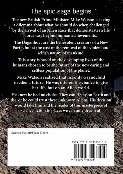 The new British Prime Minister, Mike Watson is thrown into a dilema about what he should do when challenged by the arrival of an Alien vessel that demonstrates technology way beyond Human achievments. The Daganhoyt are a benevolent creators of a new Earth, but at the cost of the removal of the violent and selfish nature of mankind. The story is based on the developing lives of the people chosen to be the future and to help repopulate the New Earth. Mike Watson realised that his only Grandchild needed a future. He was offered the chance to give her that future, but it would start on an Alien World. He knew he had no coice. They could stay on Earth and die, or he could trust these unknown Aliens. His decision would take him to a place he could only have dreamed of. Holly Watson his Granddaughter, would be the start of a new way of life that would surprise many Races in the wider Ferderation which they will now join. Many lives were about to change of so many Races that Mike Watson had no idea just how far reaching his choice for a new life for him and his Granddaughter would make to so many. A new family and an ancient race were about to come together for a new beginning for all of them.