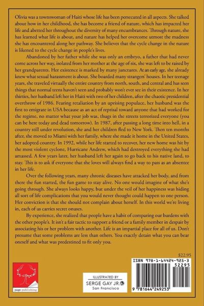 Olivia was a townswoman of Haiti whose life has been persecuted in all aspects. She talked about how in her childhood, she has become a friend of nature, which has impacted her life and abetted her throughout the diversity of many encumbrances. Through nature, she has learned what life is about, and nature has helped her overcome utmost the madness she has encountered along her pathway. She believes that the cycle change in the nature is likened to the cycle change in people's lives. Abandoned by her father while she was only an embryo, a father that had never come across her way, isolated from her mother at the age of six, she was left to be raised by her grandparents. Her existence is marked by many junctures. At an early age, she already knew what sexual harassment is about. She boarded many strangers' houses. In her teenage years, she traveled virtually the entire country from north, south, and central and has seen things that normal teens haven't seen and probably won't ever see in their existence. In her thirties, her husband left her in Haiti with two of her children, after the chaotic presidential overthrow of 1986. Fearing retaliation by an uprising populace, her husband was the first to emigrate in USA because as an act of reprisal toward anyone that had worked for the regime, no matter what your job was, thugs in the streets terrorized everyone (you can be here today and dead tomorrow). In 1987, after passing a long time into hell, in a country still under revolution, she and her children fled to New York. Then ten months after, she moved to Miami with her family, where she made it home in the United States, her adopted country. In 1992, while her life started to recover, her new home was hit by the most violent cyclone, Hurricane Andrew, which had destroyed everything she had amassed. A few years later, her husband left her again to go back to his native land, to stay. This is to ask if everyone that she loves will always find a way to pass as an absentee in her life. Over the following years, many chronic diseases have attacked her body, and from there the fun started, the fun game to stay alive. No one would imagine of what she's going through. She always looks happy, but under the veil of her happiness was hiding all sort of life complications that you would never thought could happen to one person. Her conviction is that she should not complain about herself. In this world we're living in, each of us carries secret onuses. By experience, she realized that people have a habit of comparing our burdens with the other people's. It isn't a fair tactic to support a friend or a family member in despair by associating his or her problem with another. Life is an impartial place for all of us. Don't presume that some problems are less than others. You exactly detain what you can bear oneself and what was predestined to fit only you.