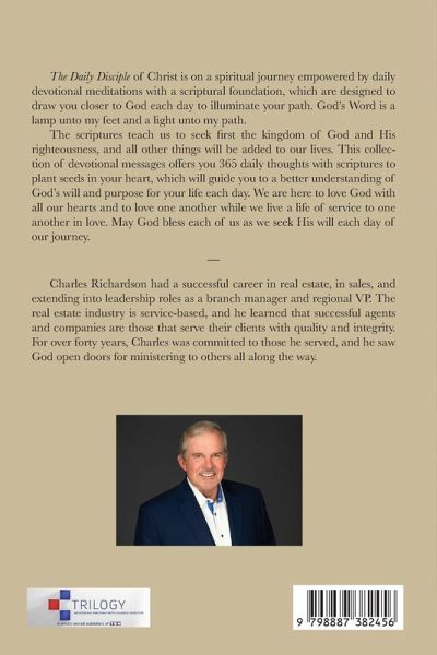 The Daily Disciple of Christ is on a spiritual journey empowered by daily devotional meditations with a scriptural foundation, which are designed to draw you closer to God each day to illuminate your path. God's Word is a lamp unto my feet and a light unto my path. The scriptures teach us to seek first the kingdom of God and His righteousness, and all other things will be added to our lives. This collection of devotional messages offers you 365 daily thoughts with scriptures to plant seeds in your heart, which will guide you to a better understanding of God's will and purpose for your life each day. We are here to love God with all our hearts and to love one another while we live a life of service to one another in love. May God bless each of us as we seek His will each day of our journey.