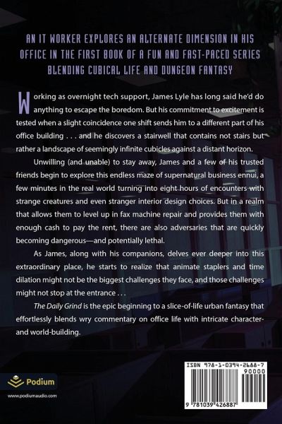 An IT worker explores an alternate dimension in his office in the first book of a fun and fast-paced series blending cubical life and dungeon fantasy. Working as overnight tech support, James Lyle has long said he'd do anything to escape the boredom. But his commitment to excitement is tested when a slight coincidence one shift sends him to a different part of his office building . . . and he discovers a stairwell that contains not stairs but rather a landscape of seemingly infinite cubicles against a distant horizon. Unwilling (and unable) to stay away, James and a few of his trusted friends begin to explore this endless maze of supernatural business ennui, a few minutes in the real world turning into eight hours of encounters with strange creatures and even stranger interior design choices. But in a realm that allows them to level up in fax machine repair and provides them with enough cash to pay the rent, there are also adversaries that are quickly becoming dangerous?and potentially lethal. As James, along with his companions, delves ever deeper into this extraordinary place, he starts to realize that animate staplers and time dilation might not be the biggest challenges they face, and those challenges might not stop at the entrance . . . The Daily Grind is the epic beginning to a slice-of-life urban fantasy that effortlessly blends wry commentary on office life with intricate character- and world-building.