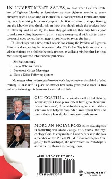 Eighteen months. That's all you have. If you are in investment sales, that's how long you have to build a pipeline and start raising money. Or else. The problem? Most investment firms don't provide the tools and training for their fundraisers. Why? Because the majority of fundraisers learned from watching others and considered that ""training."" The net result? High turnover and unhappy careers. Fortunately, there's a better way. Dakota is a multibillion-dollar fundraising organization that has perfected the four principles of investment sales success: set proper expectations, know who to call on, know what to say, and build a killer follow-up system. These four principles, when applied consistently, lead to outstanding results. Whether you're an investment salesperson and want to exponentially increase your effectiveness by learning the proper way to work or an executive who's tired of the rampant turnover that plagues most firms, The Dakota Way proves that you don't have to be born with anything special to be great at investment sales. You just need the right training-and a proven process to follow.