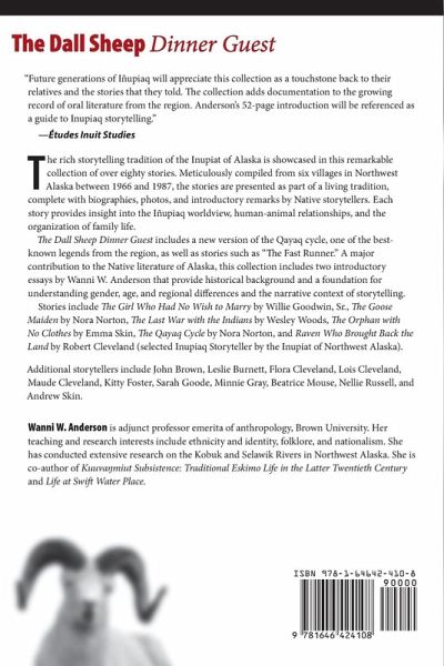 The rich storytelling tradition of the Inupiat of Alaska is showcased in this remarkable collection of over eighty stories. Meticulously compiled from six villages in Northwest Alaska between 1966 and 1987, the stories are presented as part of a living tradition, complete with biographies, photos, and introductory remarks by Native storytellers. Each story provides insight into the Iñupiaq worldview, human-animal relationships, and the organization of family life. The Dall Sheep Dinner Guest includes a new version of the Qayaq cycle, one of the best-known legends from the region, as well as stories such as "The Fast Runner." A major contribution to the Native literature of Alaska, this collection includes two introductory essays by Wanni W. Anderson that provide historical background and a foundation for understanding gender, age, and regional differences and the narrative context of storytelling. Stories include The Girl Who Had No Wish to Marry by Willie Goodwin, Sr., The Goose Maiden by Nora Norton, The Last War with the Indians by Wesley Woods, The Orphan with No Clothes by Emma Skin, The Qayaq Cycle by Nora Norton, and Raven Who Brought Back the Land by Robert Cleveland (selected Iñupiaq Storyteller by the Inupiat of Northwest Alaska). Additional storytellers include John Brown, Leslie Burnett, Flora Cleveland, Lois Cleveland, Maude Cleveland, Kitty Foster, Sarah Goode, Minnie Gray, Beatrice Mouse, Nellie Russell, and Andrew Skin.