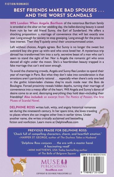 "Ross will steal your heart with this utterly delightful, romantic friends-to-lovers retelling of Beauty and the Beast." - HEATHER WEBB, USA Today bestselling author of Queens of London In 1873 Paris, a marriage of convenience between a ballet-dancing beauty and a beastly earl is about to get messy. Best friends make bad spouses . . . and worse scandals. When Angela Bartham of the notorious Bartham family is stranded at the altar on her wedding day, she's saved from ruin by her old friend Sunny, the Earl of Sunderland. He offers a startlingly generous proposition: a marriage of convenience that will last exactly one year. Long enough for society to stop gossiping. Long enough for the press to lose interest. Then they'll quietly annul their unconsummated union. Left without choices, Angela agrees. But Sunny is no longer the sweet but awkward boy she grew up with-and who once loved her. A mysterious trip abroad has transformed him into a surly, secretive beast of a rake who can't seem to stand the sight of her. Nor is Angela the romantic girl who once danced all night under the moon. She's a heartbroken beauty trapped in a fake marriage that can't end soon enough. To avoid the chattering crowds, Angela and Sunny flee London to spend their year of marriage in Paris. But what they don't take into consideration is that emotions aren't particularly rational . . . especially when there's only one bed in the gothic kitten-laden chateau they're stuck inside near the Bois de Boulogne. Forced proximity reveals hidden depths, turning their marriage of convenience into a messy affair of the heart. Will Angela and Sunny's dance of desire come to an end, destroying everything they hold dear-including their friendship? Standalone book that can be read out of series order. Includes an extended excerpt from The Poetics of Passion by Delphine Ross. PREVIOUS PRAISE FOR DELPHINE ROSS: "A beguiling Victorian romance filled with secret identities, hidden passion, and family loyalty . . . for fans of Evie Dunmore, Mimi Matthews, and Emily Sullivan." - Historical Novel Review "Charming and sexy . . . a novel that will enchant readers!" - ELIZA KNIGHT, USA Today bestselling author of The Rebel Wears Plaid "Chock full of compelling characters, charm, and heartfelt emotion."- HARPER ST. GEORGE, author of The Duchess Takes a Husband "Delphine Ross conjures . . . the era with a master hand. A fascinating read!"- MIMI MATTHEWS, USA Today bestselling author of The Belle of Belgrave Square