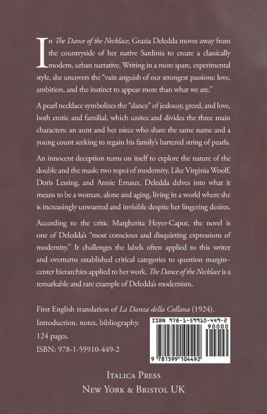 In The Dance of the Necklace, Grazia Deledda moves away from the countryside of her native Sardinia to create a classically modern, urban narrative. Writing in a more spare, experimental style, she uncovers the "vain anguish of our strongest passions: love, ambition, and the instinct to appear more than what we are." A pearl necklace symbolizes the "dance" of jealousy, greed, and love, both erotic and familial, which unites and divides the three main characters: an aunt and her niece who share the same name and a young count seeking to regain his family's bartered string of pearls. An innocent deception turns on itself to explore the nature of the double and the mask: two topoi of modernity. Like Virginia Woolf, Doris Lessing, and Annie Ernaux, Deledda delves into what it means to be a woman, alone and aging, living in a world where she is increasingly unwanted and invisible despite her lingering desires. According to the critic Margherita Heyer-Caput, the novel is one of Deledda's "most conscious and disquieting expressions of modernity." It challenges the labels often applied to this writer and overturns established critical categories to question margin-center hierarchies applied to her work. The Dance of the Necklace is a remarkable and rare example of Deledda's modernism. First English translation of La Danza della Collana (1924). Introduction, notes, bibliography. 124 pages.
