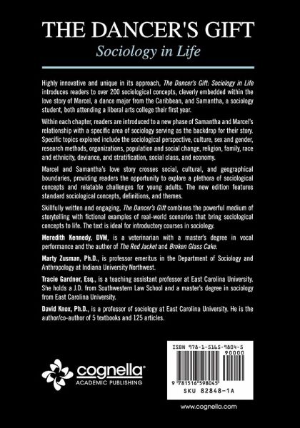 Highly innovative and unique in its approach, The Dancer’s Gift: Sociology in Life introduces readers to over 200 sociological concepts, cleverly embedded within the love story of Marcel, a dance major from the Caribbean, and Samantha, a sociology student, both attending a liberal arts college their first year. Within each chapter, readers are introduced to a new phase of Samantha and Marcel’s relationship with a specific area of sociology serving as the backdrop for their story. Specific topics explored include the sociological perspective, culture, sex and gender, research methods, organizations, population and social change, religion, family, race and ethnicity, deviance, and stratification, social class, and economy. Marcel and Samantha’s love story crosses social, cultural, and geographical boundaries, providing readers the opportunity to explore a plethora of sociological concepts and relatable challenges for young adults. The new edition features standard sociological concepts, definitions, and themes. Skillfully written and engaging, The Dancer’s Gift combines the powerful medium of storytelling with fictional examples of real-world scenarios that bring sociological concepts to life. The text is ideal for introductory courses in sociology. Tracie Gardner, Esq., is a teaching assistant professor at East Carolina University. She holds a J.D. from Southwestern Law School and a master’s degree in sociology from East Carolina University. David Knox, Ph.D., is a professor of sociology at East Carolina University. He is the author/co-author of 5 textbooks and 125 articles. Meredith Kennedy, DVM, is a veterinarian with a master’s degree in vocal performance and the author of The Red Jacket and Broken Glass Cake. Marty Zusman, Ph.D., is professor emeritus in the Department of Sociology and Anthropology at Indiana University Northwest.