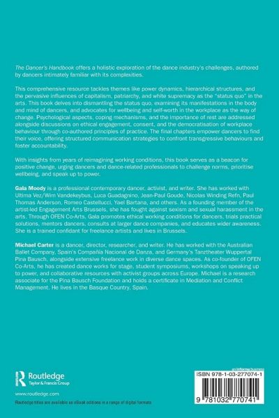 This comprehensive resource tackles themes like power dynamics, hierarchical structures, and the pervasive influences of capitalism, patriarchy, and white supremacy as the "status quo" in the arts. This book delves into dismantling the status quo, examining its manifestations in the body and mind of dancers, and advocates for wellbeing and self-worth in the workplace as the way of change. Psychological aspects, coping mechanisms, and the importance of rest are addressed alongside discussions on ethical engagement, consent, and the democratisation of workplace behaviour through co-authored principles of practice. The final chapters empower dancers to find their voice, offering structured communication strategies to confront transgressive behaviours and foster accountability.
