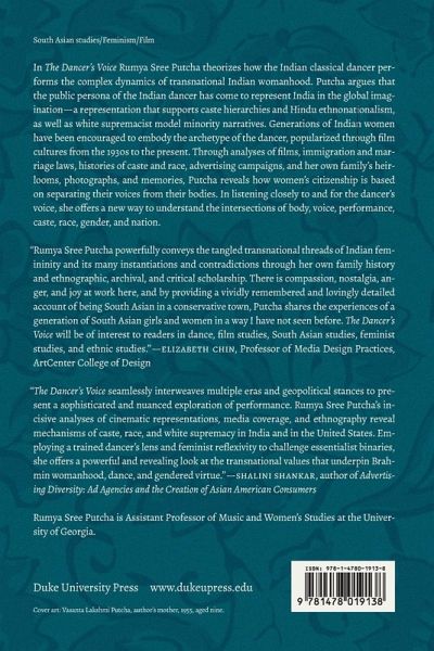 In The Dancer's Voice Rumya Sree Putcha theorizes how the Indian classical dancer performs the complex dynamics of transnational Indian womanhood. Putcha argues that the public persona of the Indian dancer has come to represent India in the global imagination-a representation that supports caste hierarchies and Hindu ethnonationalism, as well as white supremacist model minority narratives. Generations of Indian women have been encouraged to embody the archetype of the dancer, popularized through film cultures from the 1930s to the present. Through analyses of films, immigration and marriage laws, histories of caste and race, advertising campaigns, and her own family's heirlooms, photographs, and memories, Putcha reveals how women's citizenship is based on separating their voices from their bodies. In listening closely to and for the dancer's voice, she offers a new way to understand the intersections of body, voice, performance, caste, race, gender, and nation.