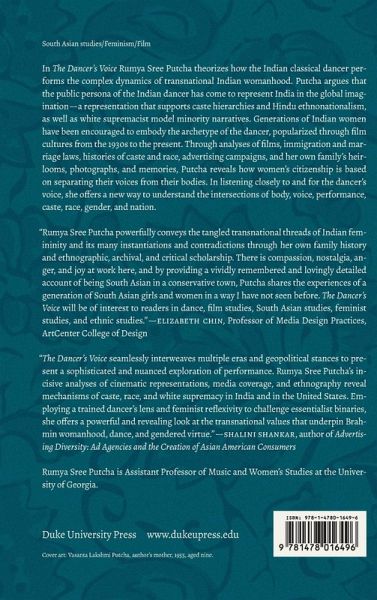 In The Dancer's Voice Rumya Sree Putcha theorizes how the Indian classical dancer performs the complex dynamics of transnational Indian womanhood. Putcha argues that the public persona of the Indian dancer has come to represent India in the global imagination-a representation that supports caste hierarchies and Hindu ethnonationalism, as well as white supremacist model minority narratives. Generations of Indian women have been encouraged to embody the archetype of the dancer, popularized through film cultures from the 1930s to the present. Through analyses of films, immigration and marriage laws, histories of caste and race, advertising campaigns, and her own family's heirlooms, photographs, and memories, Putcha reveals how women's citizenship is based on separating their voices from their bodies. In listening closely to and for the dancer's voice, she offers a new way to understand the intersections of body, voice, performance, caste, race, gender, and nation.