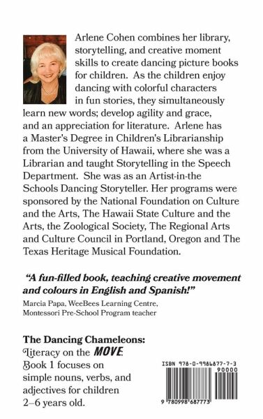 From the author of Stories on the Move: Integrating Literature and Movement with Children from Infants to Age 14 (over 1,500 sold and used by parents, teachers, and librarians internationally), Arlene Cohen has created the Literacy on the Move Series: entertaining picture books that develop literacy skills. The first in the series for 2-6 year olds, is The Dancing Chameleons. Also see The Dancing Reptiles for 4-8 year olds, and The Dancing Dogs for 6-10 year olds. All are now available on Amazon. Bored being just verde (green) on a leaf or marron (brown) on a trunk, Carlos the Chameleon ventures out on a limb to see and be more colors. He turns amarillo (yellow) when he dances La Mariposa Mambo with the yellow butterfly, roja (red) when he dances La Rumba Rosa with the red roses, and purpura (purple) when he dances El Tulipan Tango with the purple tulips. Life is exciting now! Carlos, the multi-colored chameleon dances all over the limb, singing loudly, "Life is exciting. Life is Fun. When you're out on a limb; out in the Sun." He draws the attention of his friends back at the trunk. They tell him he better stop that nonsense or he might get caught and fried in a tortilla. But, that doesn't stop Carlos for very long. He heads back out to the limb. On the way, he makes a new friend, Carmelita who also loves to dance. She joins Carlos out on the limb until they get captured in a glass jar by a hiker. Will they get fried in a tortilla? No worry, the hiker has big plans for them. They are released into his beautiful backyard garden where they will entertain and enchant the whole neighborhood with their unique dance routines. Children easily learn new words in Spanish and English as they simultaneously develop movement agility and an appreciation of literature. Developmental biologist/educator, Charles Piaget's research revealed that movement is a central part of the learning experience. As a dancer and librarian, Arlene incorporates creative movement with early literacy skills to entertain and develop whole children. This is also a concept book that includes learning colors in English and Spanish. Now Available: The Dancing Reptiles for 4-8 year olds and The Dancing Dogs for 5-10 year olds.